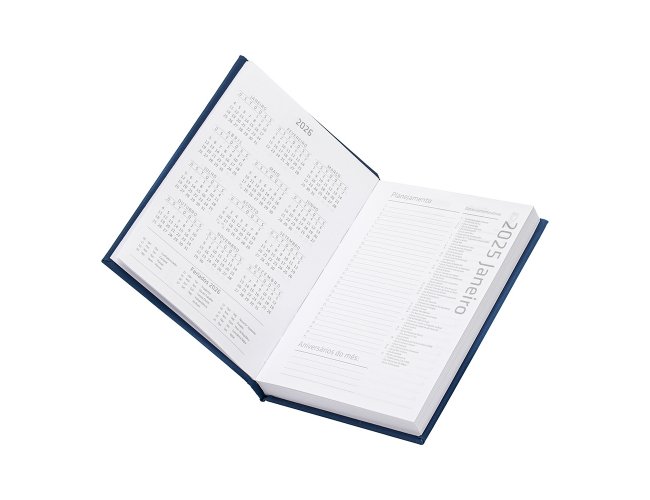 Agenda 2025 com capa emborrachada, contém páginas para dados pessoais, calendários de 2024 à 2026, planejamento e anotações.