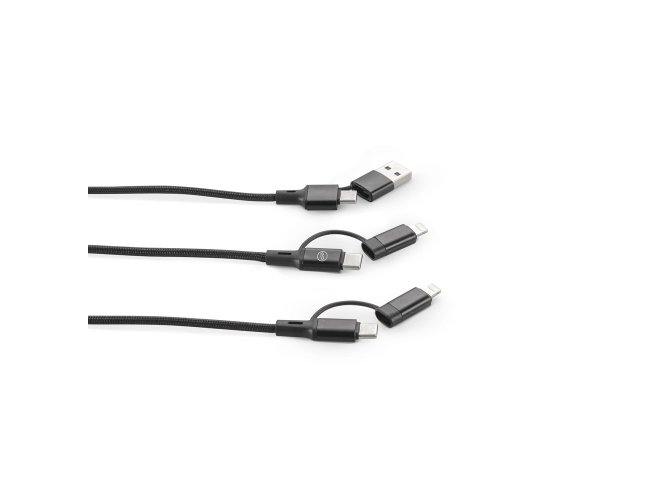 Cabo super-rápido 6 em 1 em alumínio 20% reciclado e PET 4% reciclado. Permite carregamento super-rápido de 60W via USB-C e transferência de dados. Apresenta uma entrada dupla USB-A/USB-C e duas saídas com duas portas USB-C que podem ser utilizadas em simultâneo. Em uma das extremidades tem uma saída compatível com lightning com carregamento rápido de 27W e na outra extremidade uma saída dupla micro-USB e compatível com lightning de 10W. Fornecido em caixa presente de papel kraft reciclado. 1000 x 25 mm | Caixa: 155 x 40 x 30 mm