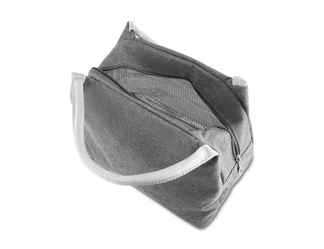 Bolsa térmica costurada, produzida em poliéster 300D na parte externa e alumínio com manta térmica no interior. Modelo sem solda, puxador de zíper em formato de colher, com capacidade para 7 litros.