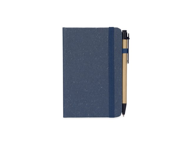 Caderneta ecológica de capa dura revestida em fibra de palha de trigo. Contém aproximadamente 80 folhas brancas com pauta, além de duas folhas de guarda, uma fita para fechamento e porta-canetas elástico. Acompanha uma caneta esferográfica de carga azul de 1,0mm com corpo em papelão e clip, acionamento por clique e ponteira em plástico.