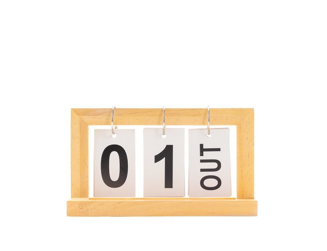 Calendário permanente de mesa com estrutura em madeira e fichas de papel cartão presas por argolas de ferro, que permitem organizar os dias em números e os meses em versões abreviadas. Acompanha chave Phillips pequena e dois parafusos para montagem.