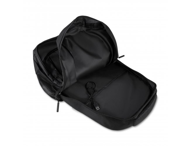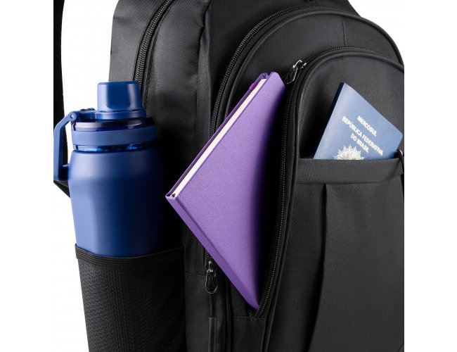 Mochila confeccionada em tecido externo de poliéster 300D e tecido interno de poliéster 190D, com capacidade total de 23 litros. Possui três bolsos frontais com zíper, compartimento principal com fechamento em zíper, dois bolsos laterais e engate para mala de viagem. Conta ainda com compartimento interno próprio para notebooks de até 15,6 polegadas.